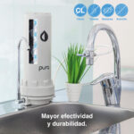 El purificador de agua con conexión sobre tarja con mayor rendimiento del mercado que elimina microbios, cloro, sus derivados e impurezas, feo gusto y olores del agua.
