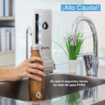 La purificación del agua es inmediata, libre de tiempos de espera. El caudal de agua purificada es muy veloz, de hasta 3 litros por minuto. Los equipos funcionan con la presión positiva del agua que ingresa. El agua a ser tratada ingresa al Purificador, toma contacto con la tecnología de purificación del Núcleo Purificador interno y se dirige purificada por el grifo del Purificador directo a tu vaso, botella, jarra, olla, biberón, directo para lo que quieras ocupar agua de excelente calidad. Esta forma de funcionamiento hace que sea muy práctico instalar un PURA® para obtener agua rica, sin plásticos de un solo uso ni transportes innecesarios.