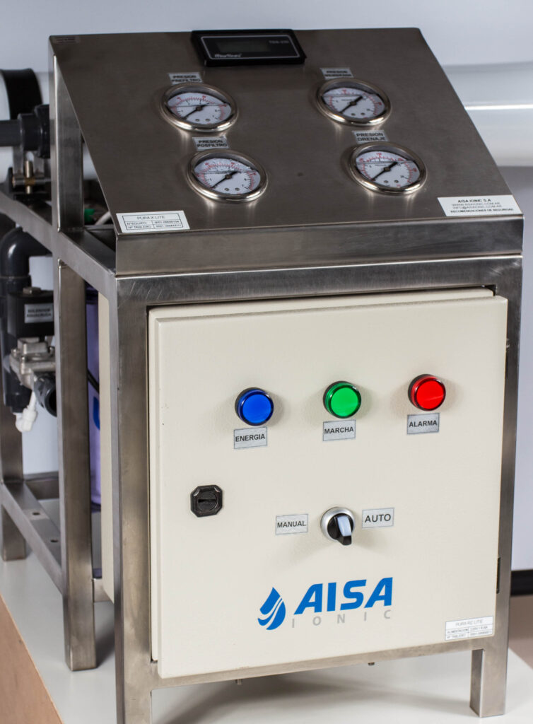 • Calidad de agua garantizada con indicadores en línea (presión, caudal y conductividad) y PLC que simplifica la operación.