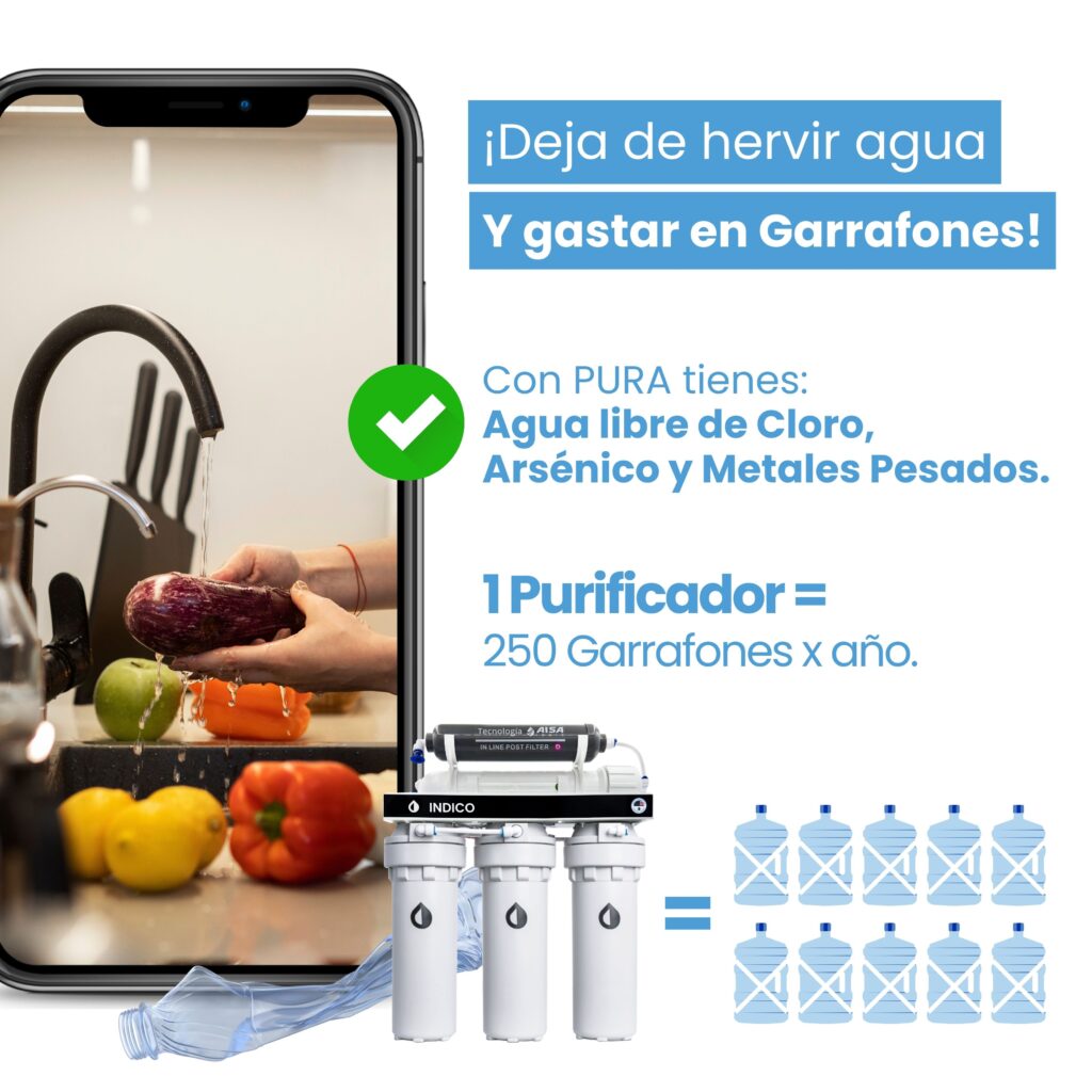 El Purificador de Agua PURA INDICO es el más eficiente sistema de purificación de agua en 5 etapas, diseñado con tecnologías propias y patentadas, para el agregado de minerales y eliminación selectiva de Arsénico. Gracias a su tecnología, efectividad y rendimiento es ampliamente utilizado en hogares y también en entornos gastronómicos.