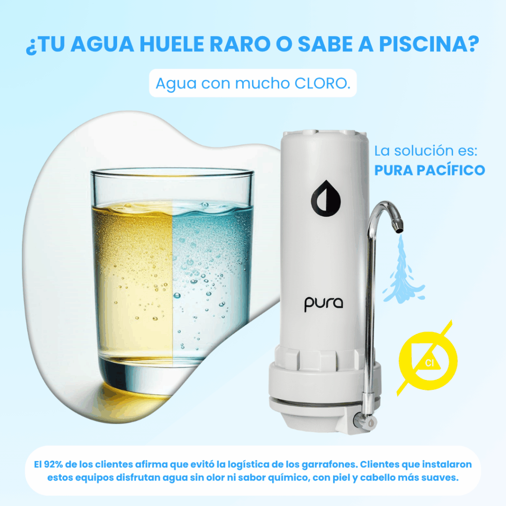 Cada Purificador PURA® utiliza tecnología propia y patentada que elimina con el mayor rendimiento, presión y caudal el 99.9% de Cloro, feo gusto y olores extraños, sustancias químicas derivados del Cloro, cloraminas, trihalometanos, compuestos orgánicos volátiles, restos de agroquímicos, sedimentos, arenillas, turbidez e impurezas. También elimina micoplásticos, BPAs, PFAS y otros contaminantes emergentes que pueden estar presentes en las redes de agua.